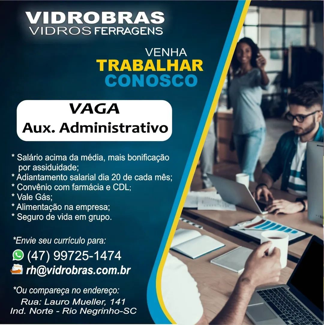 RIO NEGRINHO. A Vidrobras – Vidros e Ferragens está com oportunidade para: Vaga: Auxiliar Administrativo Oferecemos: Salário acima da média + bonificação por