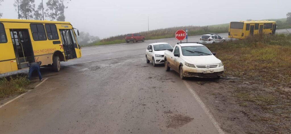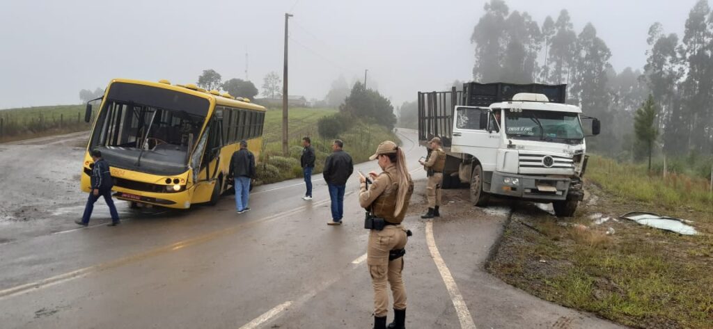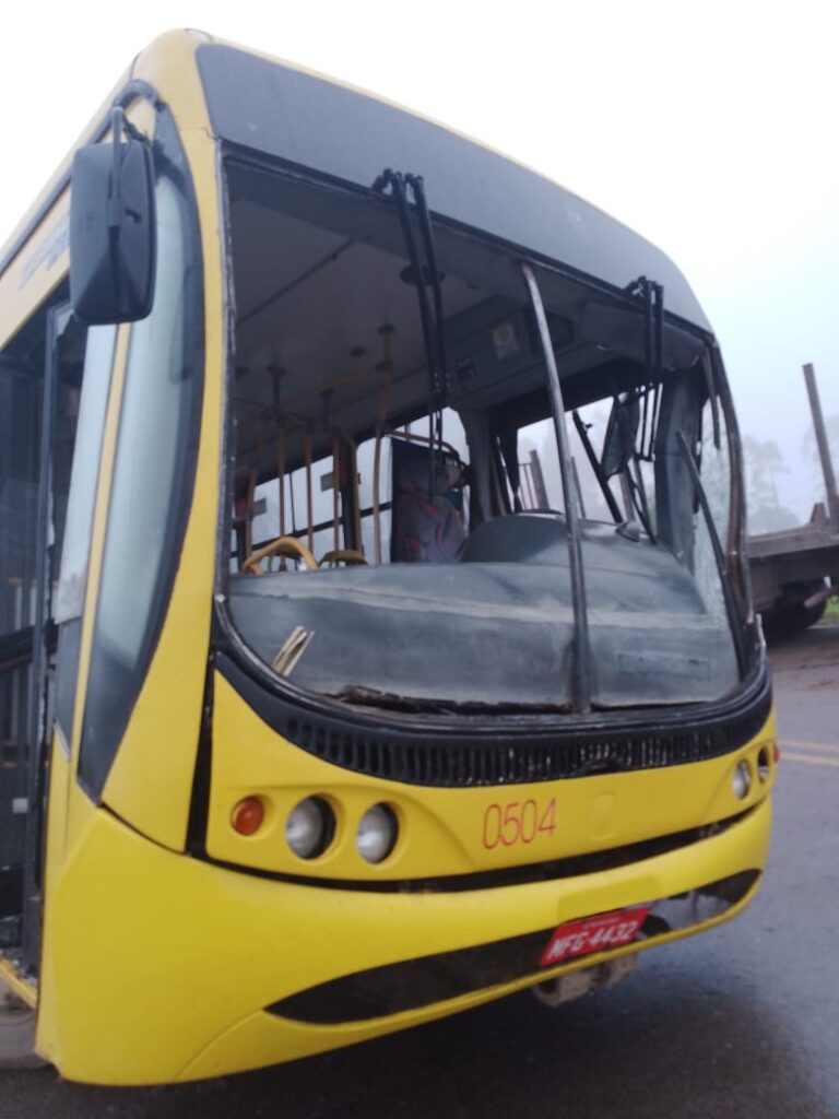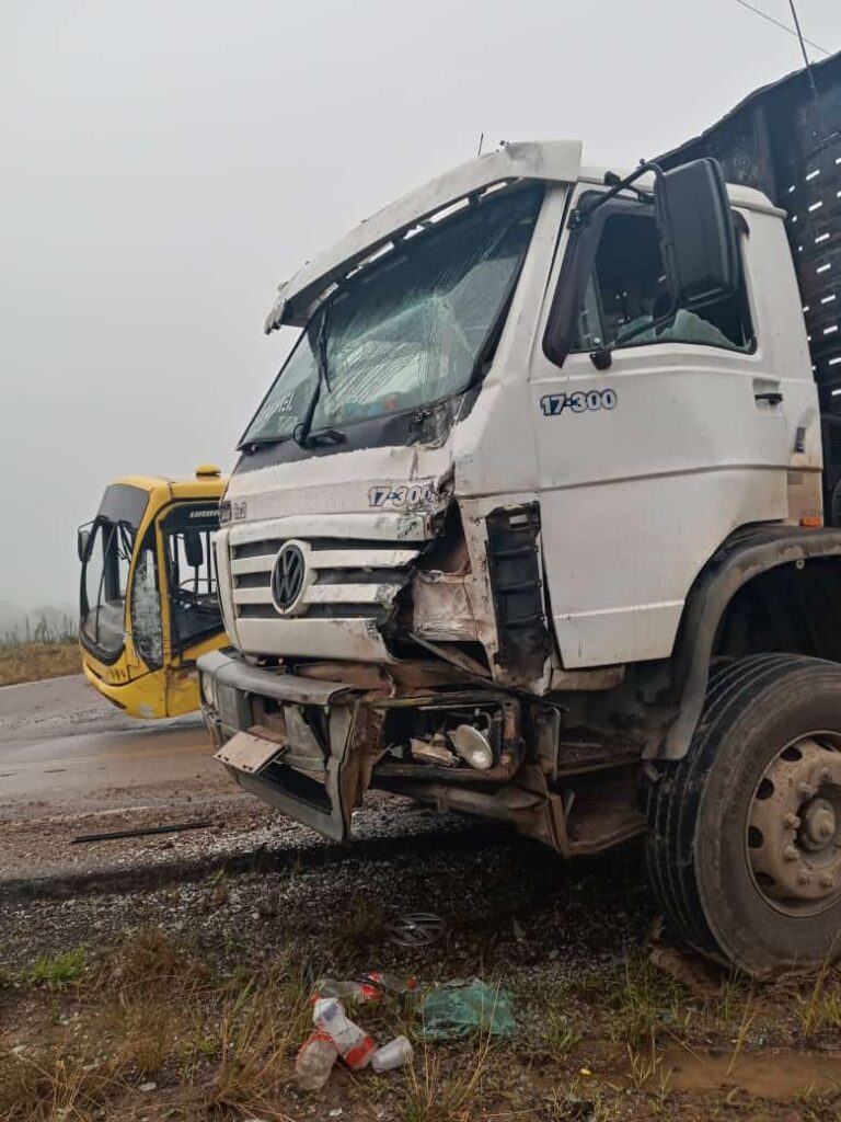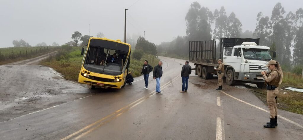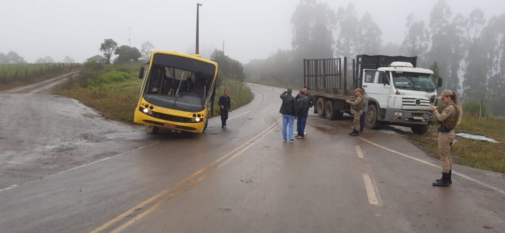 RIO NEGRINHO. Uma batida entre um ônibus do transporte escolar realizado pela Transtusa e um caminhão vazio resultou em danos materiais para os dois veículos na manhã de hoje.