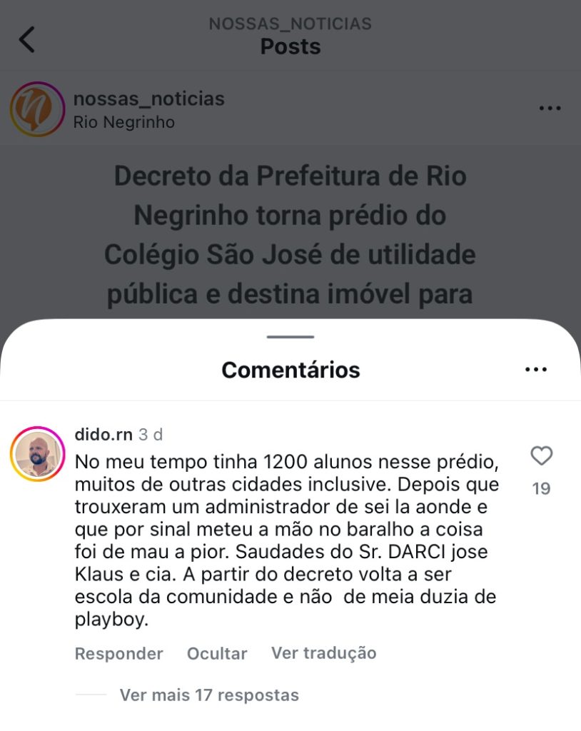 “Esse prédio pode ir à leilão justamente por isso, por conta de dívidas de outras escolas ligadas a esse mesmo CNPJ. A gente sabe que o Colégio Elias Moreira, de Joinville, e que também é da CNEC, já foi leiloado; a CNEC perdeu o prédio. Tem outras instituições da CNEC no estado (foram quatro ou cinco), que foram fechadas, pelo que fiquei sabendo. Então realmente se existe esse risco de a gente perder o prédio num futuro leilão e a gente não sabe quem vai comprar (a prefeitura não pode participar de leilão), a única forma de garantir que o Colégio continue servindo para a educação do município e a educação das nossas crianças, foi essa”.
