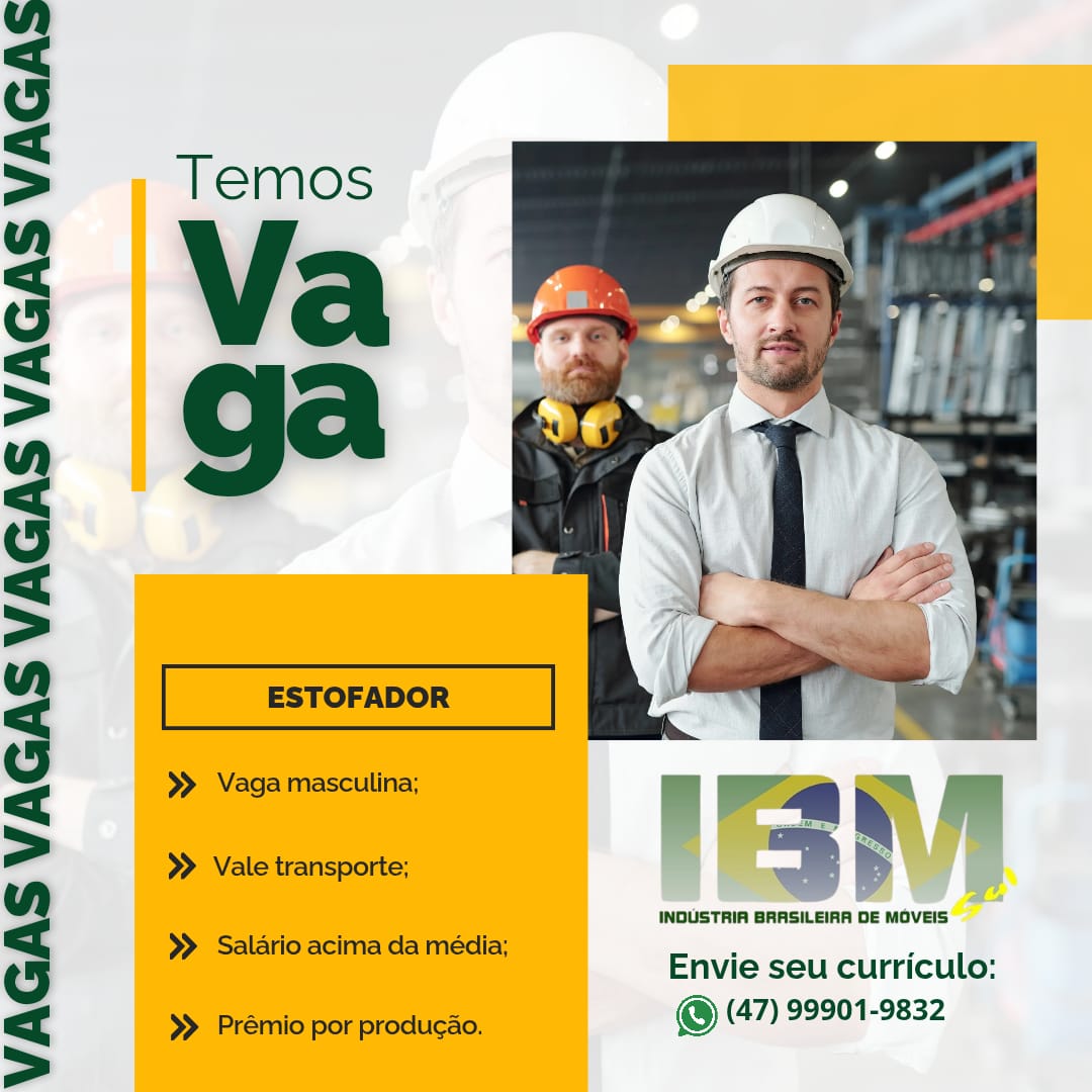 RIO NEGRINHO. IBM Móveis contrata estofador, com ou sem experiência, salário acima da média, oferece vale transporte e prêmio por produção.