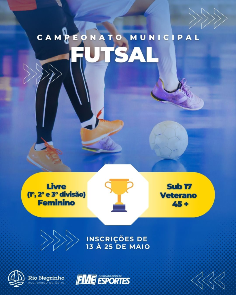 RIO NEGRINHO. A Fundação Municipal de Esportes (FME), está com inscrições abertas para o Campeonato Municipal de Futsal 2025. Se você é apaixonado por futsal e está pronto para viver muita emoção nas quadras, essa é a sua chance. As inscrições começam nesta terça-feira (13) e vão até o dia 25 de maio. Não deixe para última hora, organize sua equipe e faça sua inscrição agora mesmo!