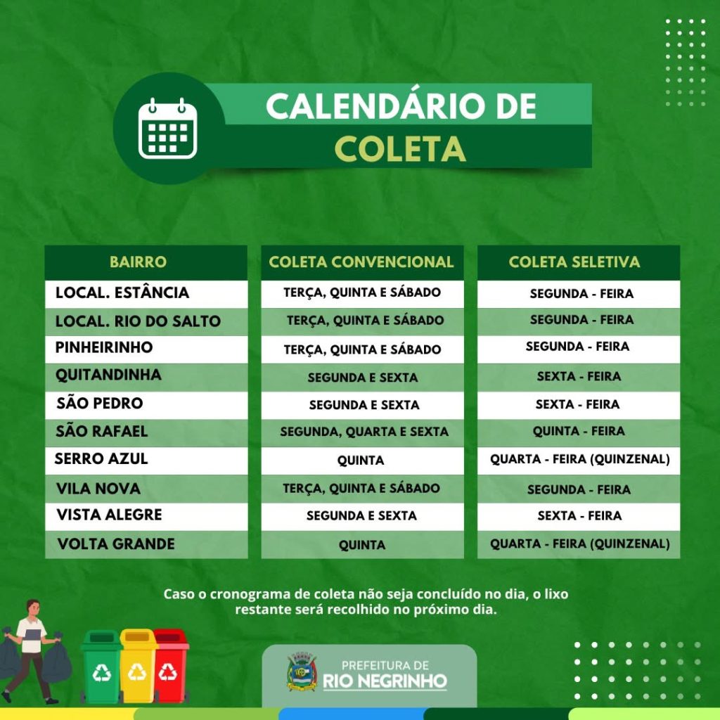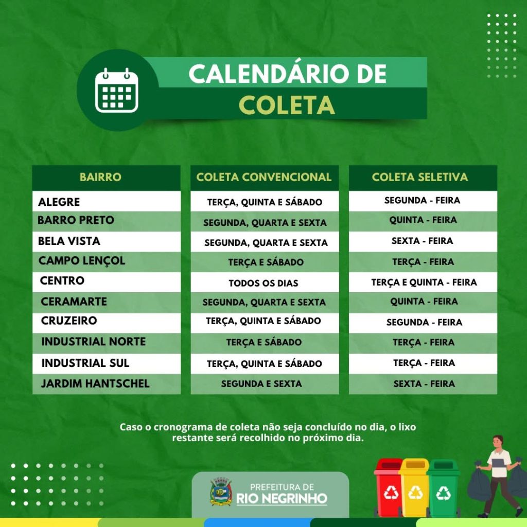 “Pedimos a colaboração de todos para conferir os dias e horários em seu bairro e descartar os resíduos corretamente. Juntos, mantemos nossa Rio Negrinho mais limpa e organizada!”, finalizou o texto.
