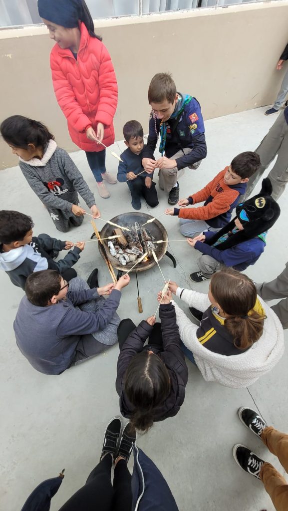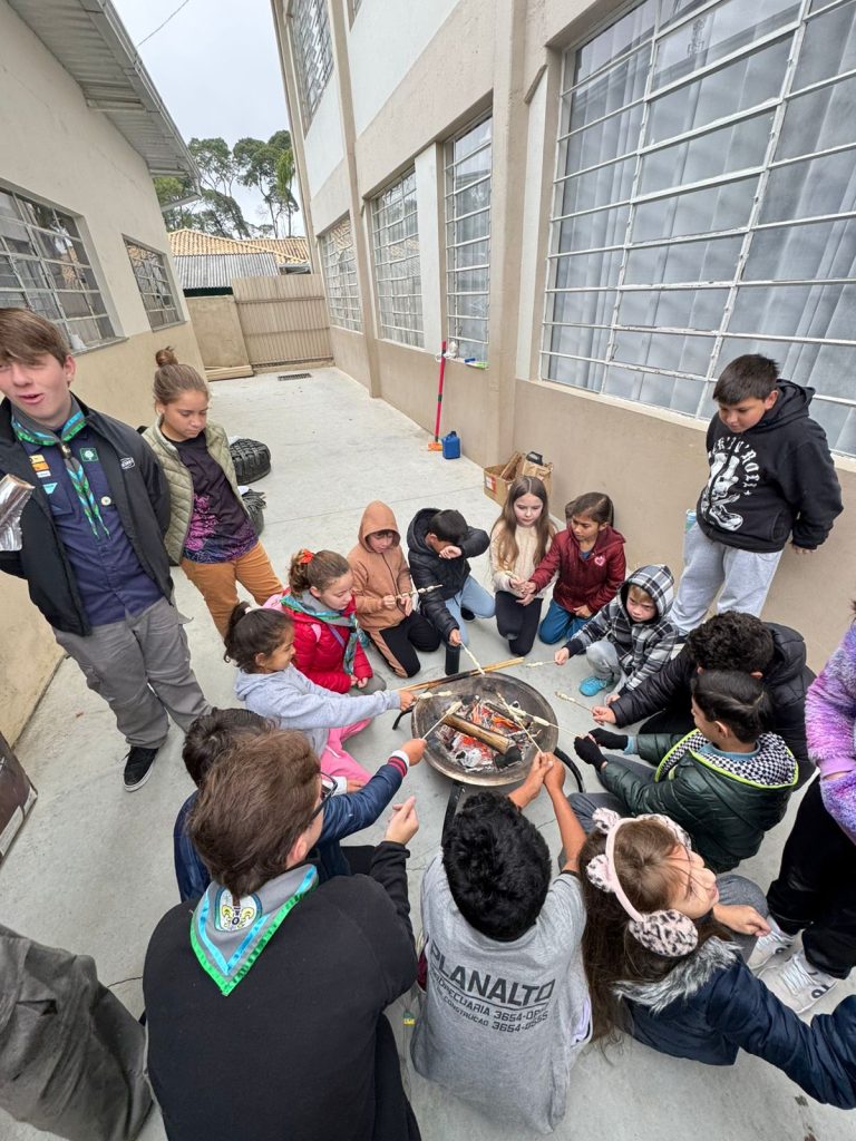Durante toda a manhã, os estudantes participaram de dinâmicas ao lado dos escoteiros de todos os ramos — Lobinho, Escoteiro, Sênior e Pioneiro — explorando de forma lúdica e educativa as práticas escoteiras. As atividades incluíram canções escoteiras, uso de bússola, nós e amarras, construção de pioneiras, além da tradicional cozinha mateira, com receitas como o pão de caçador e a banana assada no papel alumínio.