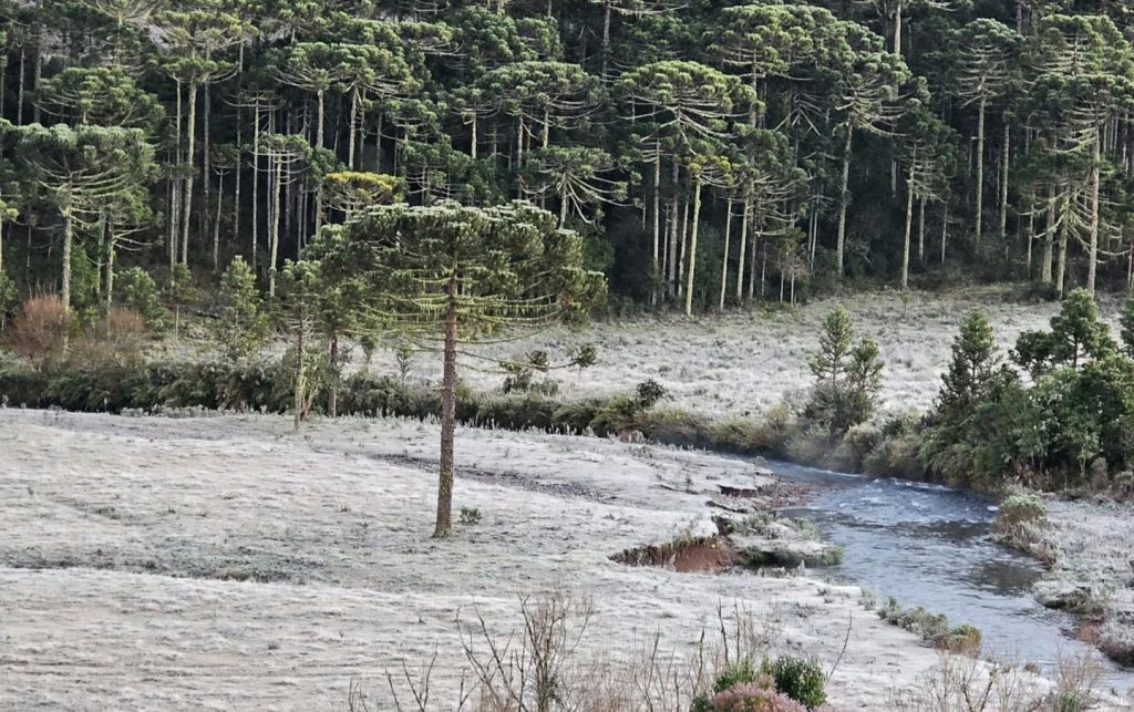 Apesar do frio intenso e das temperaturas negativas esperadas em áreas de serra e planalto, não há previsão de neve nos próximos dias. A ausência de umidade suficiente impedirá a formação de nuvens capazes de provocar precipitação invernal. Em contrapartida, a geada deve voltar com força ao Rio Grande do Sul e Santa Catarina, especialmente nas madrugadas, quando os termômetros devem marcar valores próximos ou abaixo de zero.