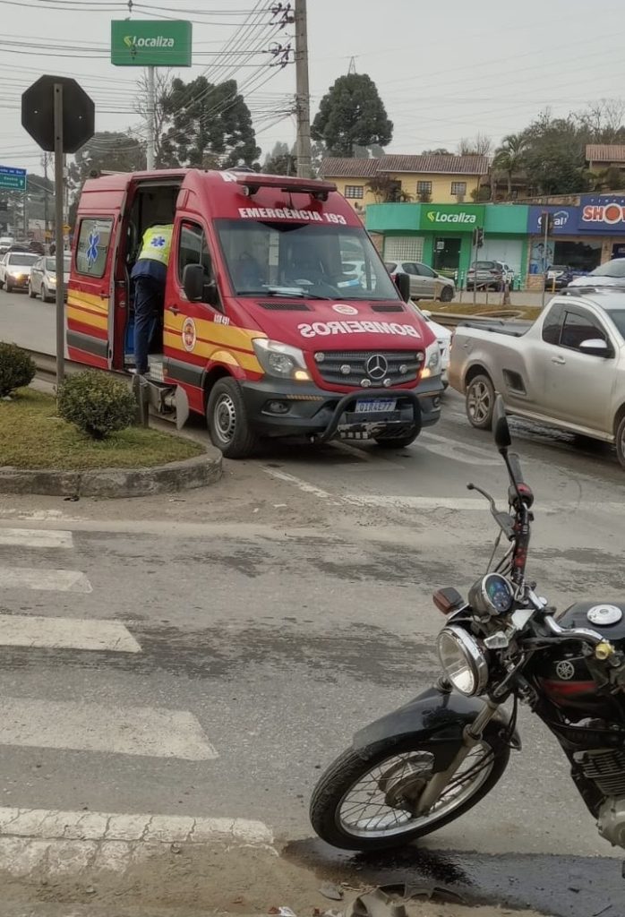 SÃO BENTO DO SUL. Um homem de 28 anos ficou ferido após um acidente envolvendo um carro e uma motocicleta na manhã desta quarta-feira (10). A colisão aconteceu por volta das 7h43 na Rua Antônio Kaesemodel, no bairro Oxford.