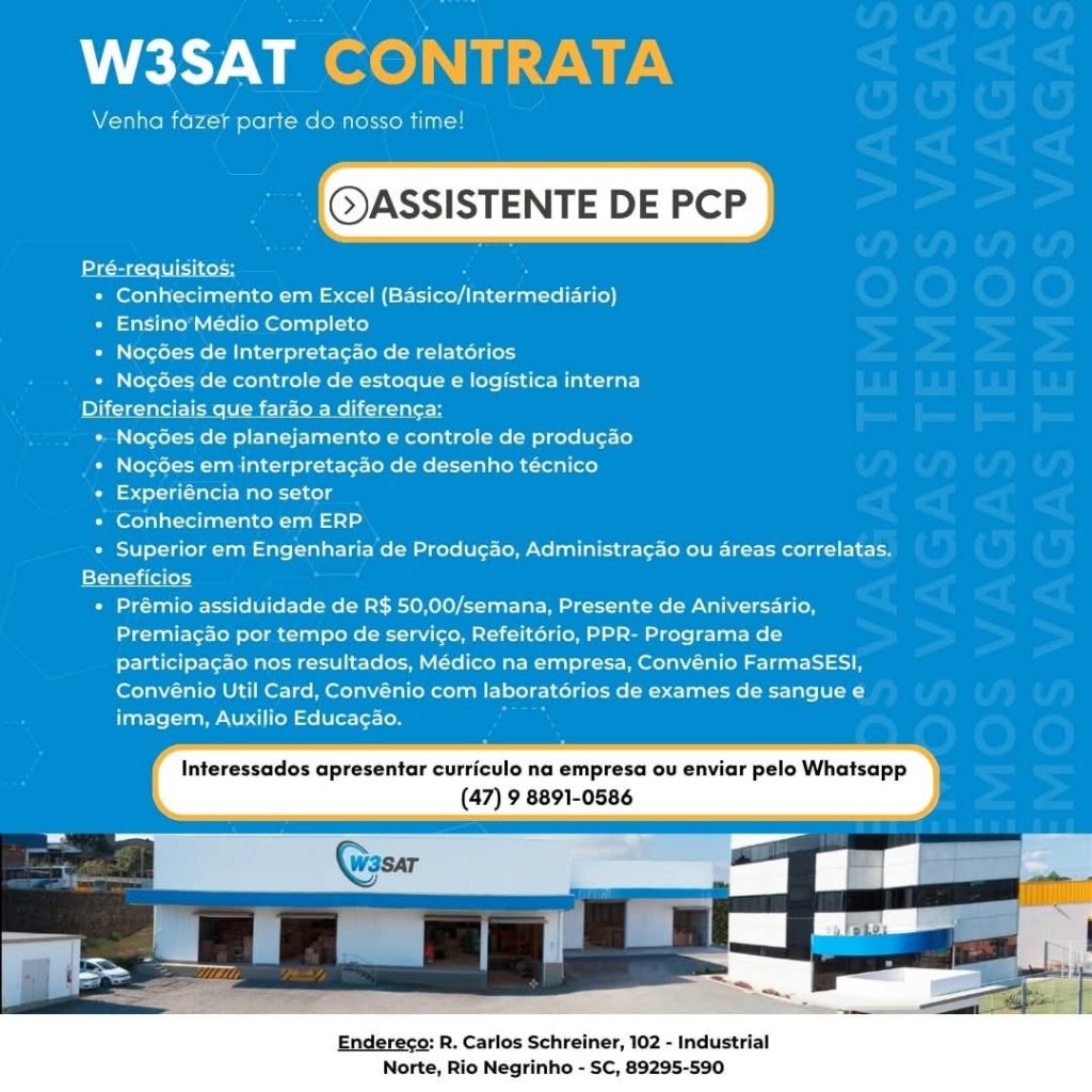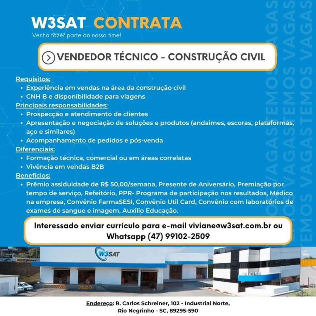 Para a vaga de Vendedor Técnico: envie para viviane@w3sat.com.br ou WhatsApp
