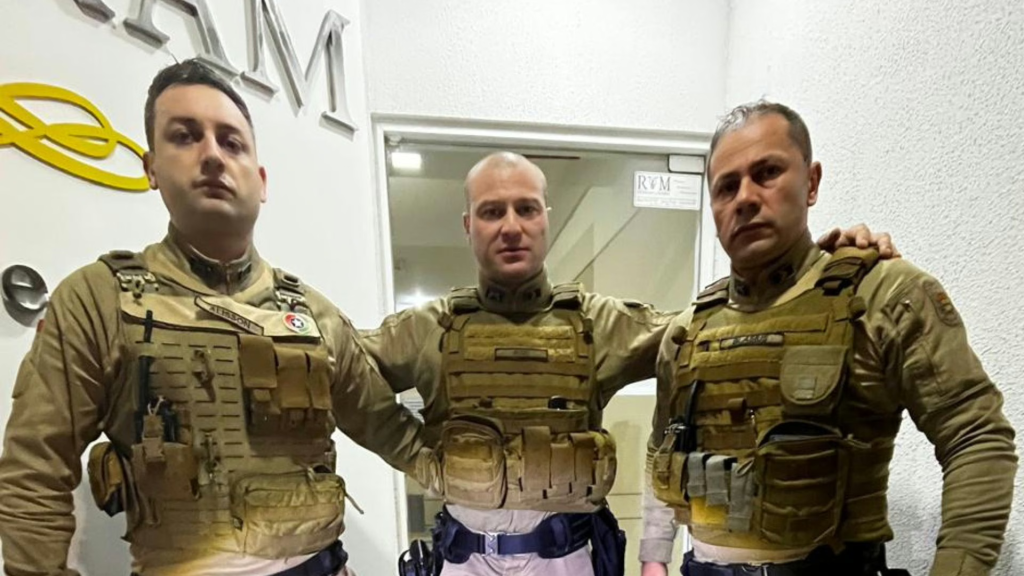 De forma tática, os policiais se aproximaram sem serem percebidos. Quando o homem se lançou parcialmente para frente, cabo Rigo conseguiu segurá-lo pelo moletom e pelo braço, impedindo a queda. “Segura na mão, segura na mão, não larga o braço dele. Para cima, para cima (vertical)”, orientava o policial, enquanto, com esforço, puxava o homem para dentro.