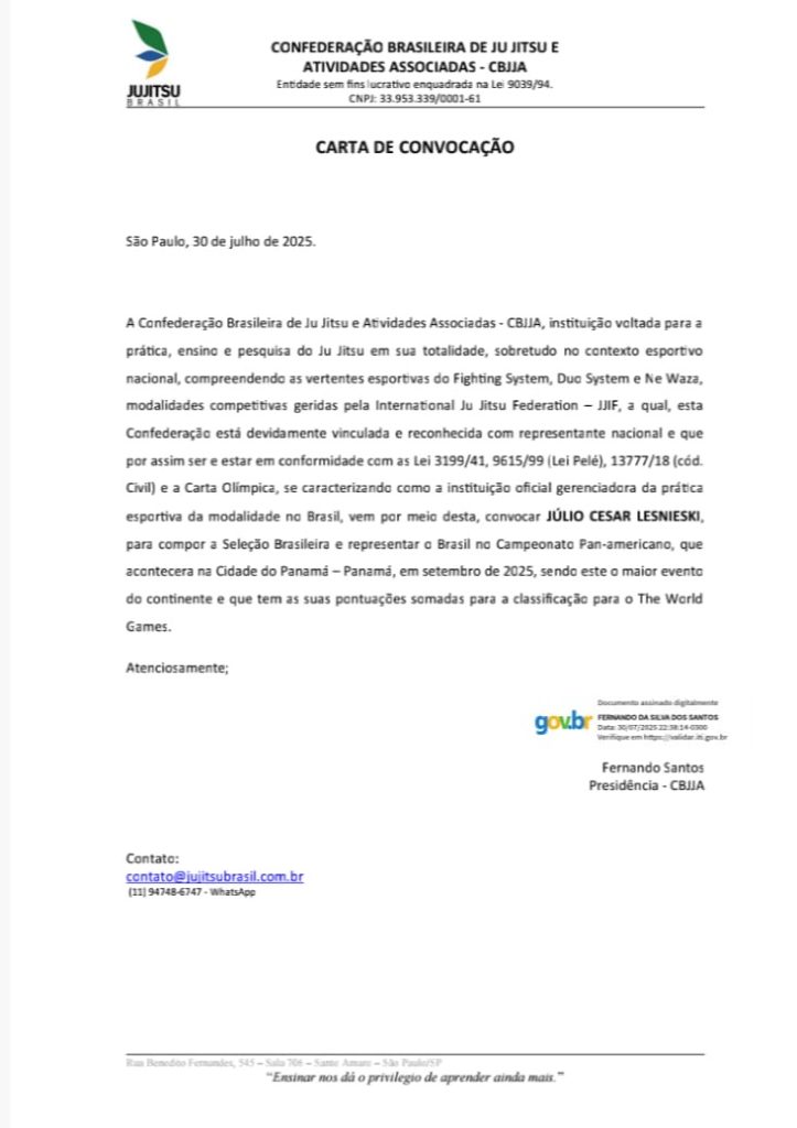 RIO NEGRINHO. Júlio Cesar Lesnieski foi convocado, na última semana, pela Confederação Brasileira de Jiu-Jitsu e Atividades Associadas (CBJJA) para compor a Seleção Brasileira e representar o país no Campeonato Pan-americano, que acontecerá na Cidade do Panamá, no Panamá, em setembro.