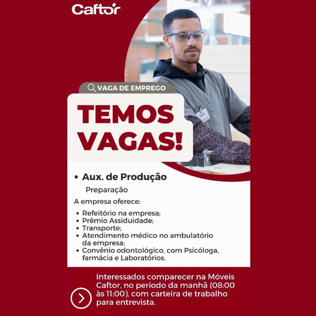 Como participar: compareça na Móveis Caftor no período da manhã (08h às 11h) com carteira de trabalho para entrevista.