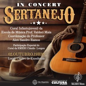 RIO NEGRINHO. A Fundação Municipal de Cultura, realiza no dia 2 de outubro, às 19h30, o In Concert Sertanejo. O espetáculo acontece no Auditório do Centro de Excelência Evaristo Stoeberl, no bairro Bela Vista.
