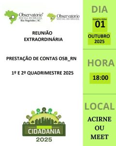 RIO NEGRINHO. O Observatório Social do Brasil de Rio Negrinho realiza nesta quarta-feira (1), às 18 horas, na sede da Associação Empresarial (Acirne), uma reunião para apresentação da prestação de contas referente ao 1º e 2º quadrimestres de 2025. O evento é aberto à comunidade.