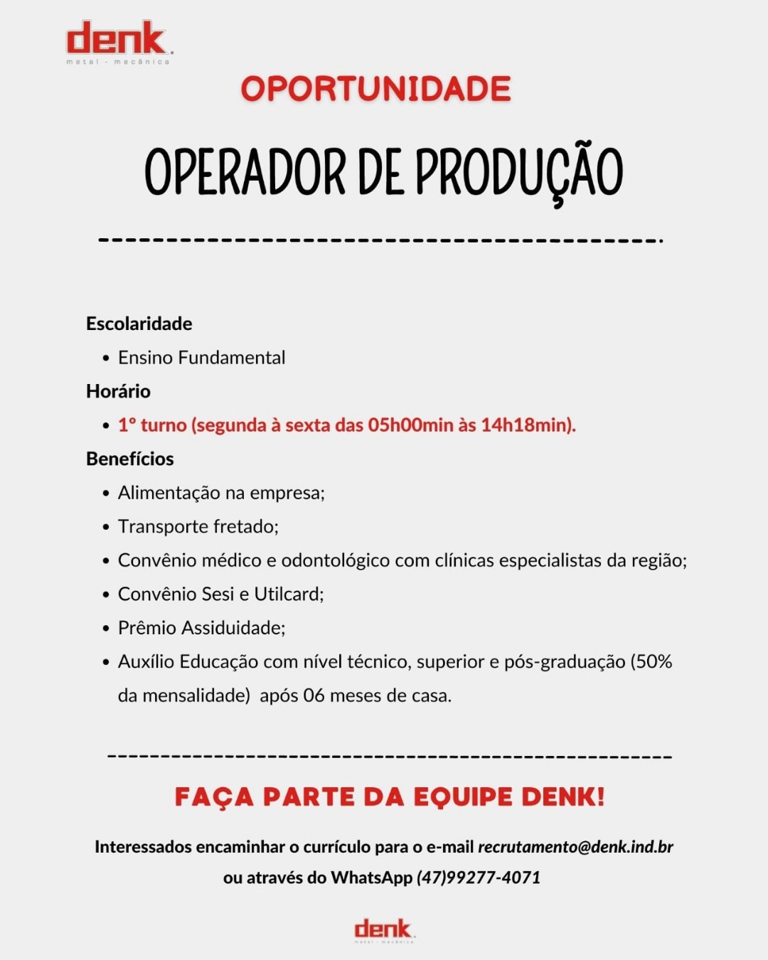 Envie seu currículo para: recrutamento@denk.ind.br