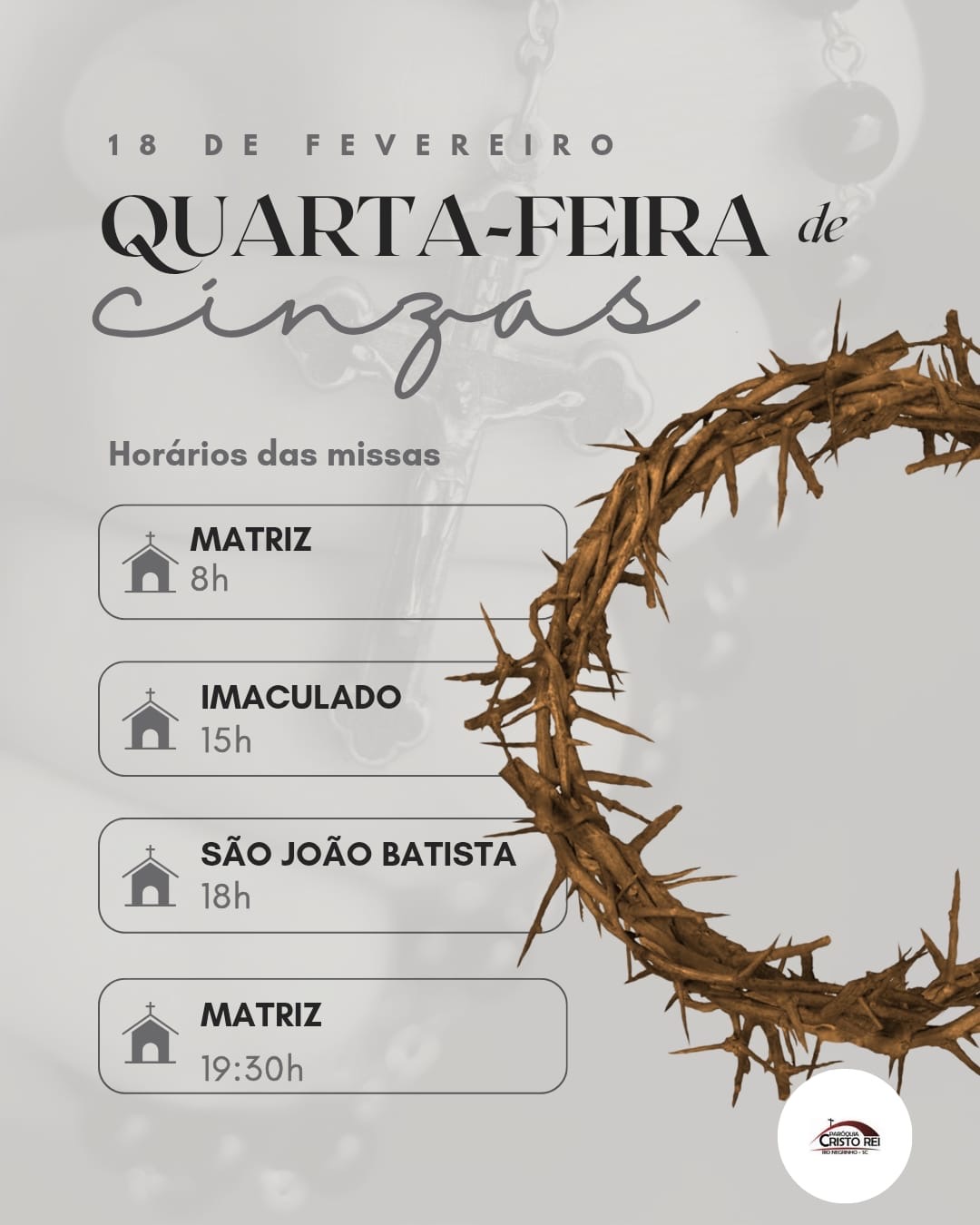Em Rio Negrinho, a programação desta Quarta-feira de Cinzas (18) começou com missa na Igreja Matriz, no Centro, e ao longo do dia, as celebrações continuam com missa às 15 horas na Igreja Imaculado Coração de Maria, no bairro São Pedro, às 18 horas na Igreja São João Batista, no bairro Quitandinha e, por fim, às 19h30 novamente na Igreja Matriz.