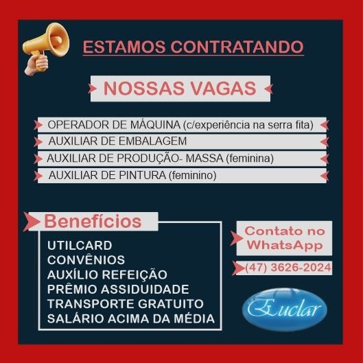 RIO NEGRINHO. A Euclar está com oportunidades abertas para quem busca uma nova chance no mercado de trabalho.