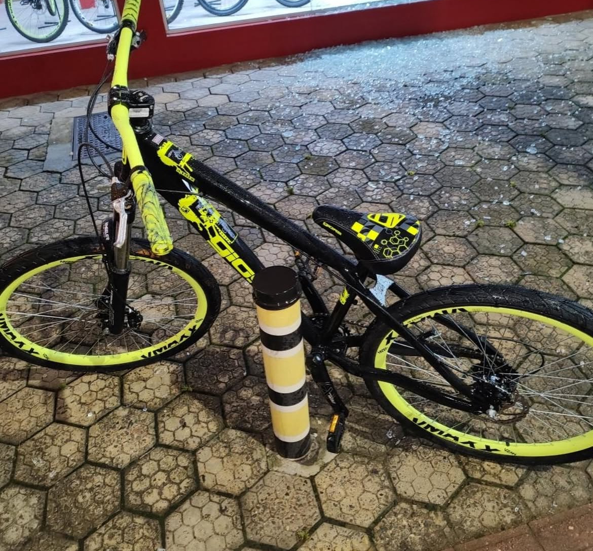 A ocorrência teve início por volta das 0h30, quando a Central de Emergências 190 recebeu informações sobre um furto em andamento. De acordo com relatos, testemunhas viram o momento em que o homem quebrou a vitrine de uma loja e levou uma bicicleta.