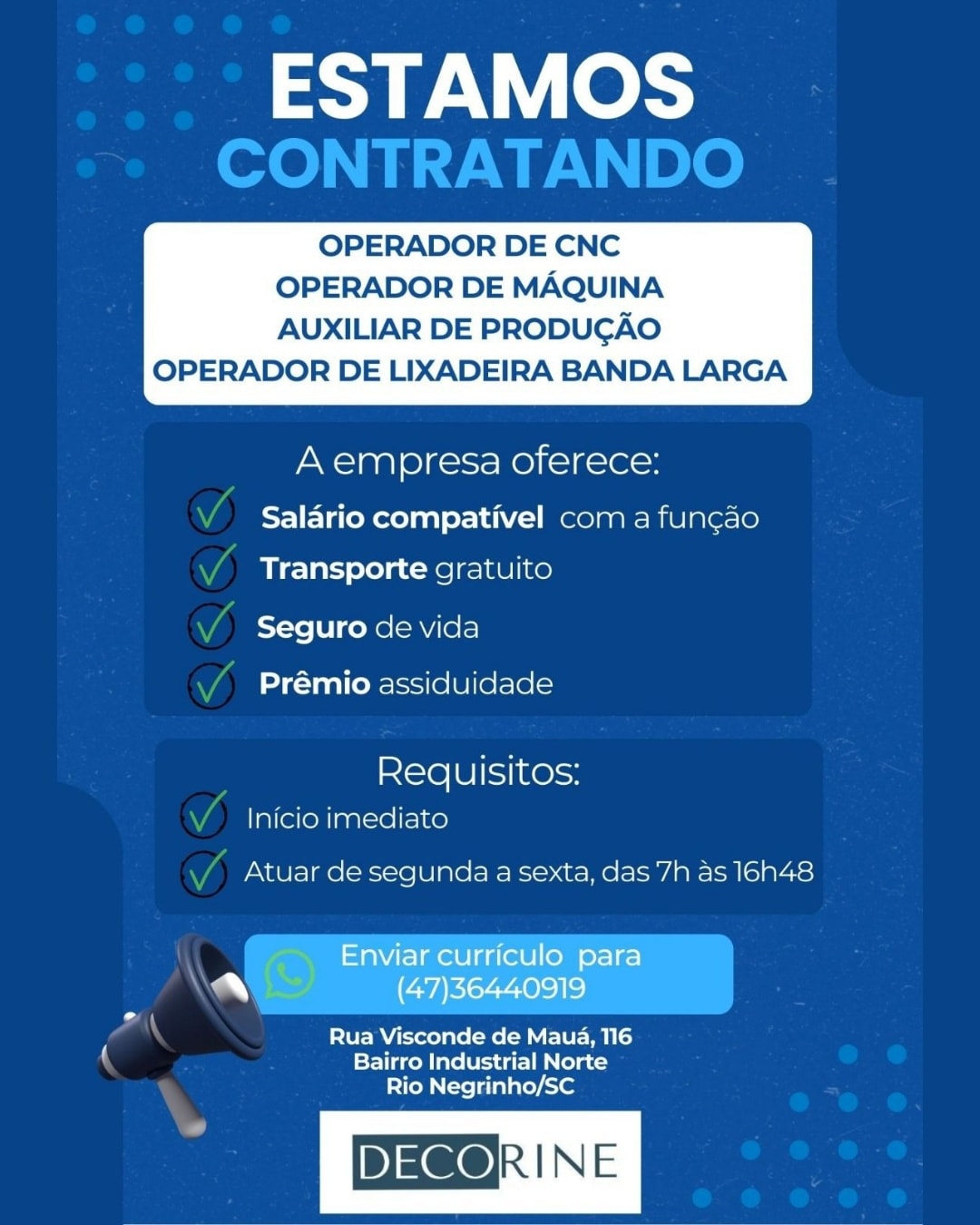 RIO NEGRINHO. A Decorine está com vagas abertas