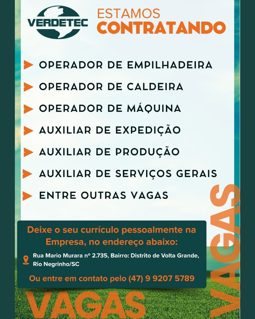 RIO NEGRINHO. A Verdetec está com diversas vagas abertas para você que busca uma nova chance no mercado de trabalho.