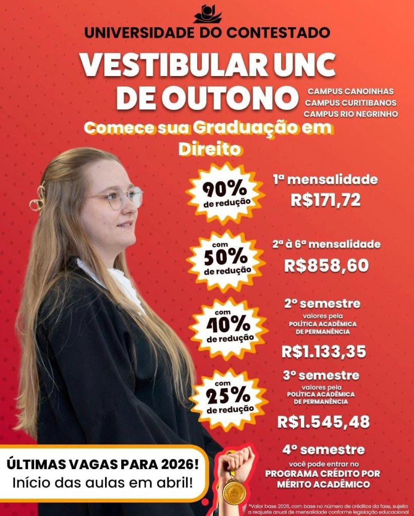 RIO NEGRINHO . Forme-se em Direito, Psicologia, Administração, Ciências Contábeis, Pedagogia ou Engenharia de Software com até 90% de redução na primeira mensalidade e descontos progressivos até o 3º semestre! Depois? Tem mais oportunidade! A partir do 4° semestre você pode entrar no Programa Crédito por Mérito Acadêmico As aulas começam em abril, essas […]