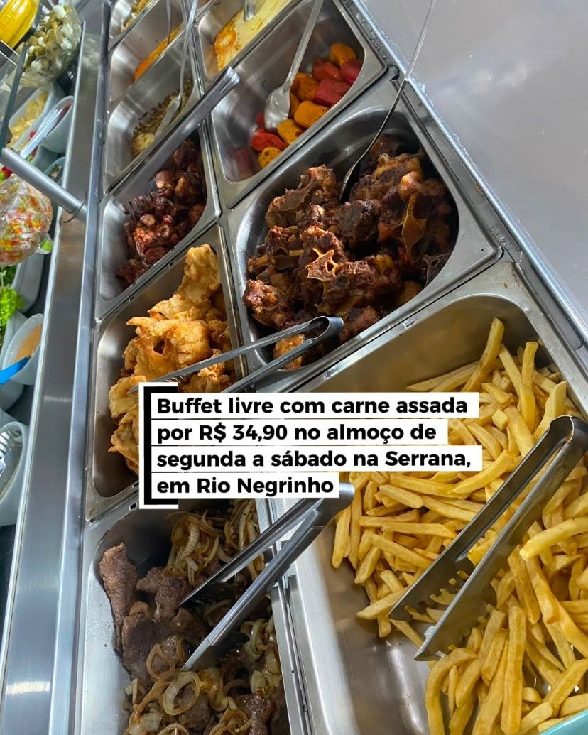 RIO NEGRINHO.De segunda a sábado, aproveite o buffet livre com carne assada no almoço da Serrana Churrascaria e Pizzaria