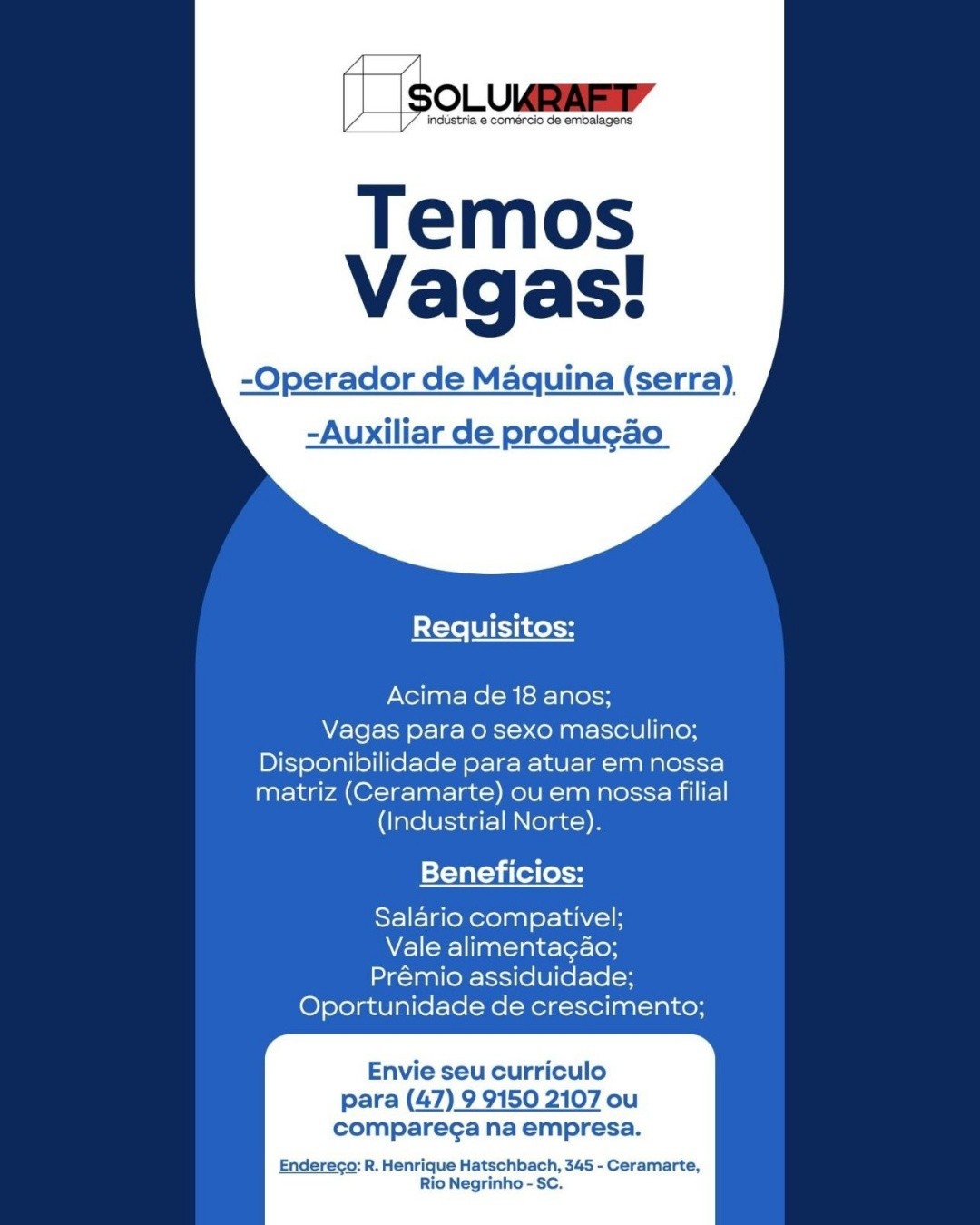 RIO NEGRINHO. A Solukraft Indústria e Comércio de Embalagens está com oportunidade aberta para