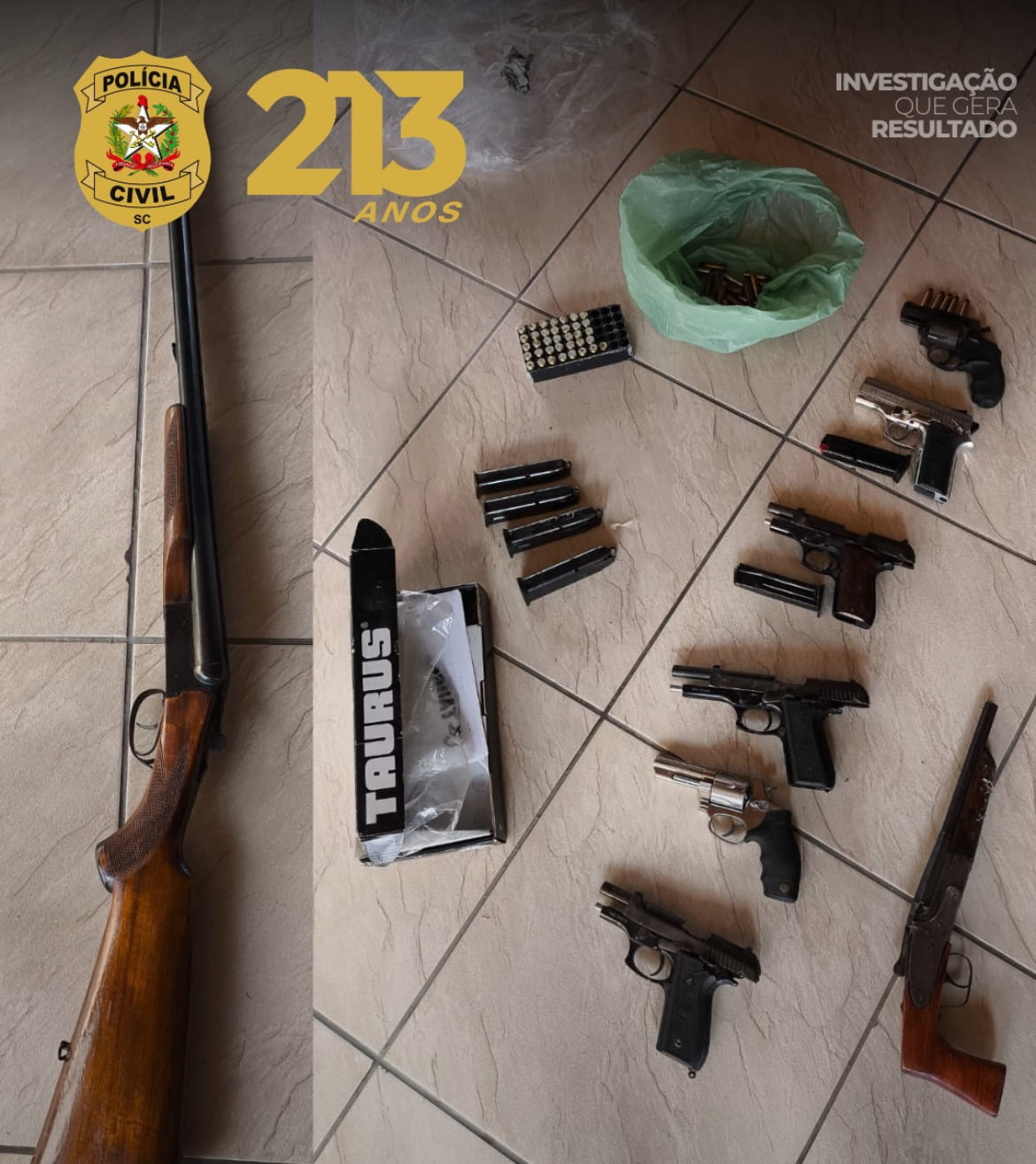 Enquanto a prisão era realizada, outra equipe cumpriu os mandados de busca em dois endereços ligados ao investigado em São Bento do Sul. Durante a ação, foram apreendidas oito armas de fogo, mais de 200 munições de diversos calibres, além de um celular iPhone e um notebook.